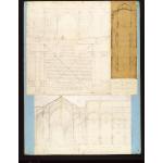 Coupe longitudinale, plan et légendes manuscrites, (380 x 335). Coupe transversale et plan, (380 x 110). Coupe perspective sur le passage couvert, (240 x 390). |