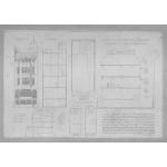 Elévation de la façade principale, coupe transversale, plan du rez-de-chaussée et coupe longitudinale, éch. 1/100. Coupe longitudinale, plan du basement et du premier étage, éch. : 1/200. Légende manuscrite. |