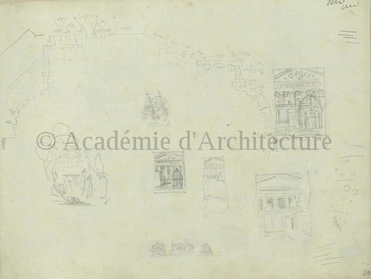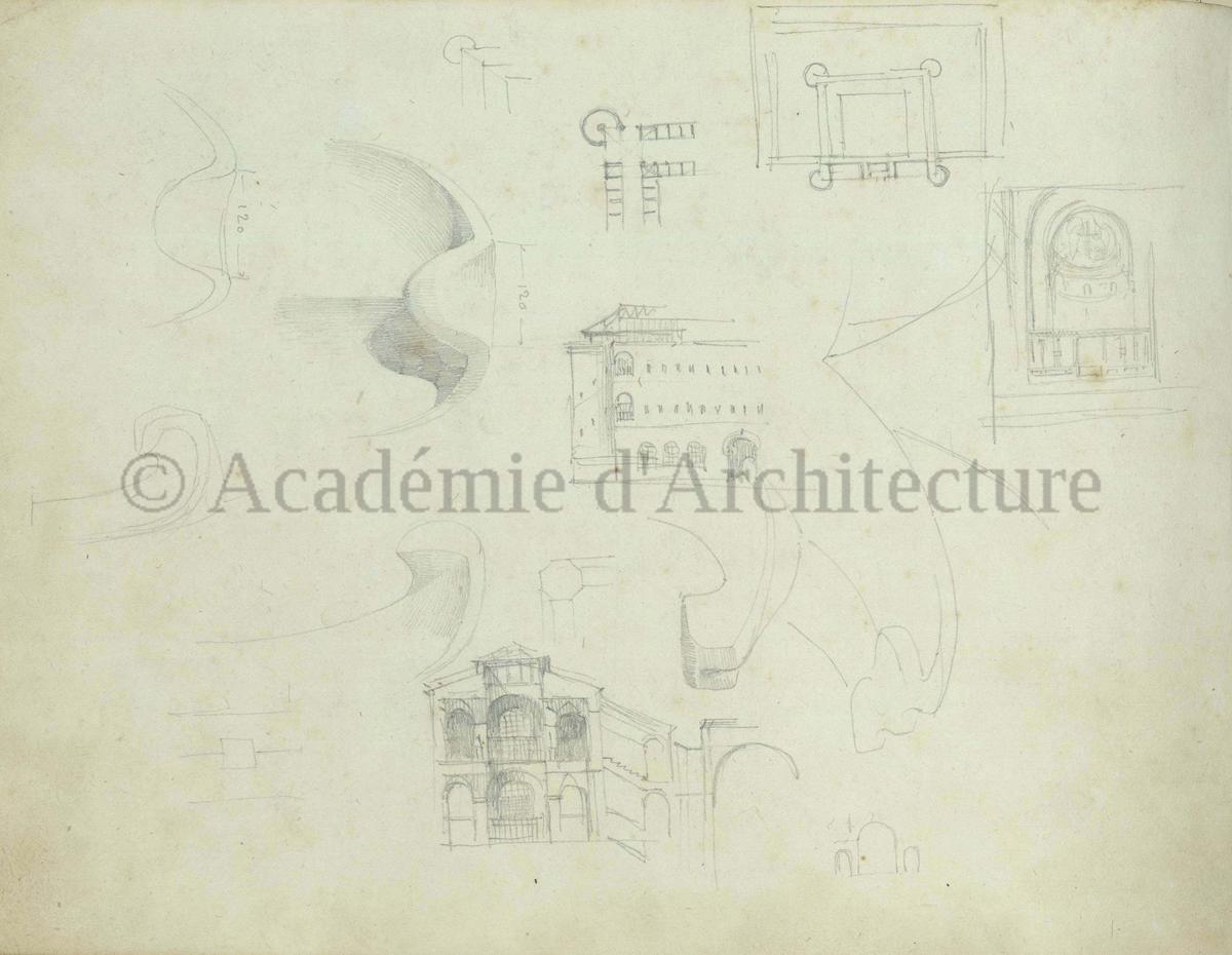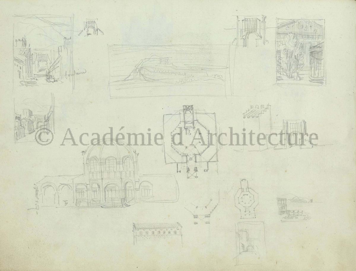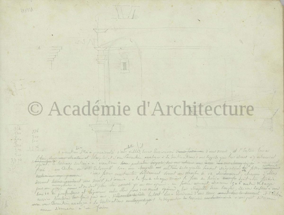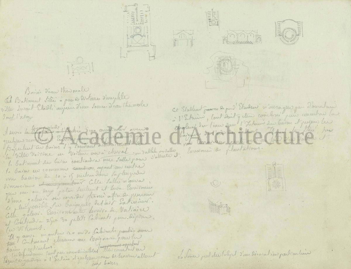 Carnet de relevés de monuments antiques ; d'esquisses pour la restauration de "Posidonia". Brouillon de lettre d'Henri Labrouste au préfet de la Seine relative à l'église de Mantes, s.d. (après 1840). Programme par Henri Labrouste d'un projet de bains d'eau thermale. |