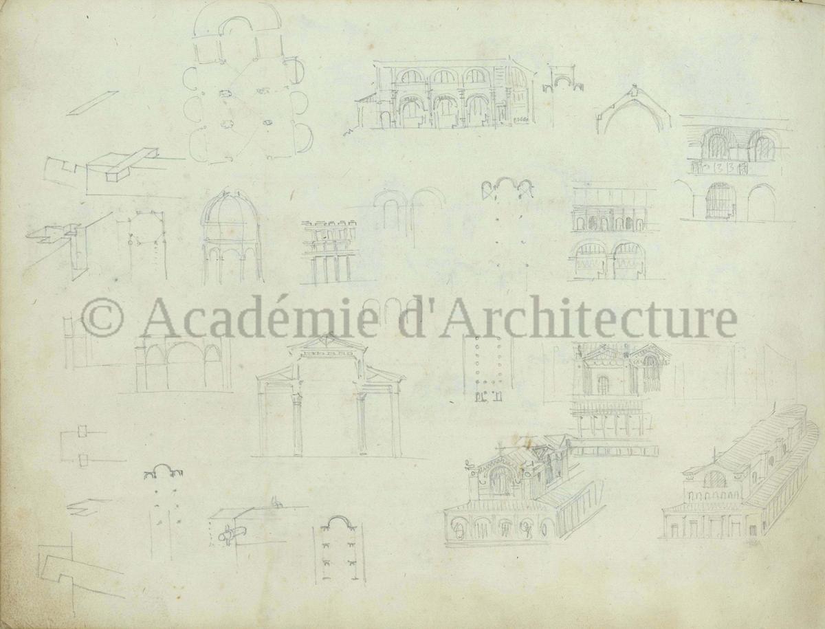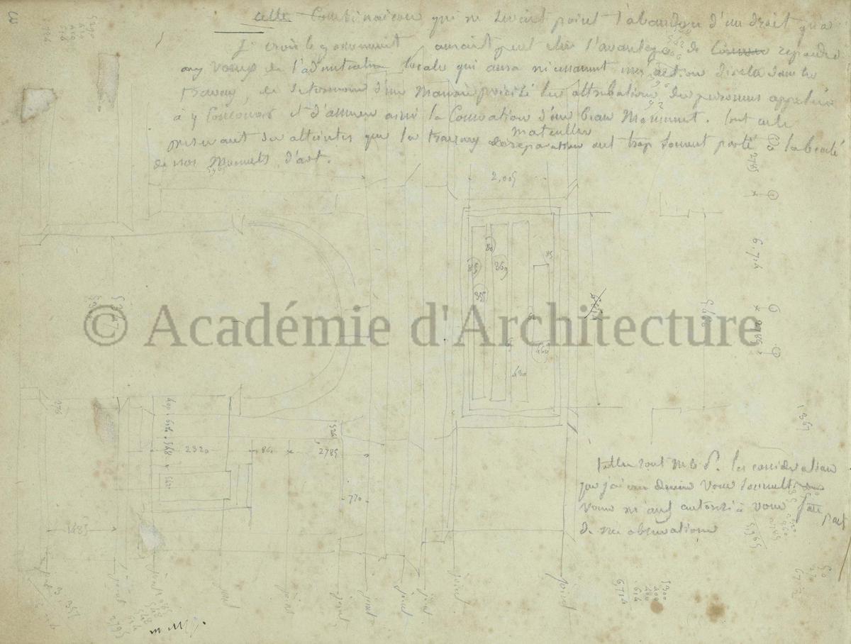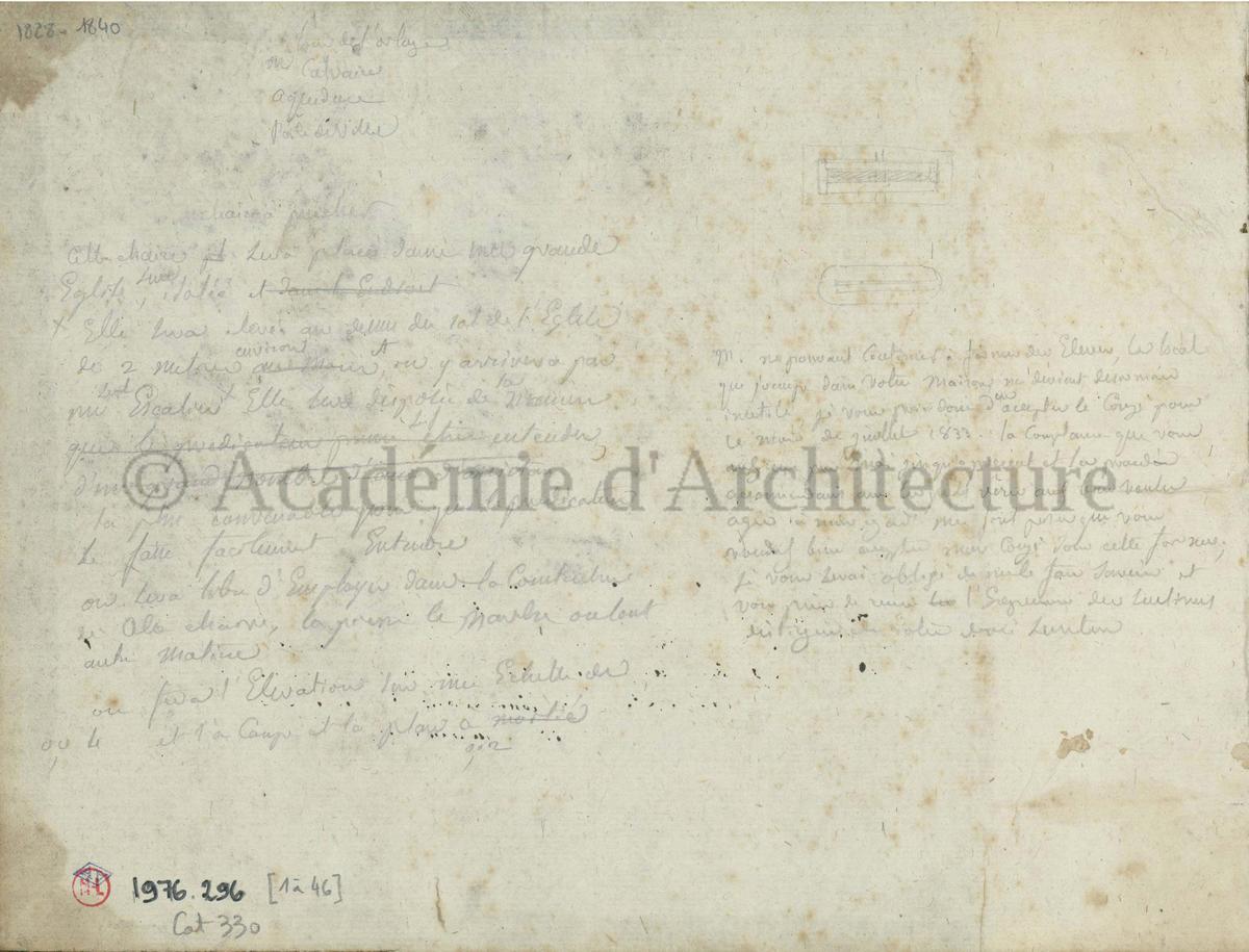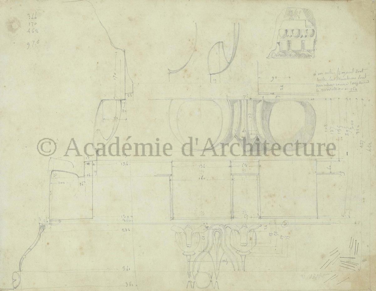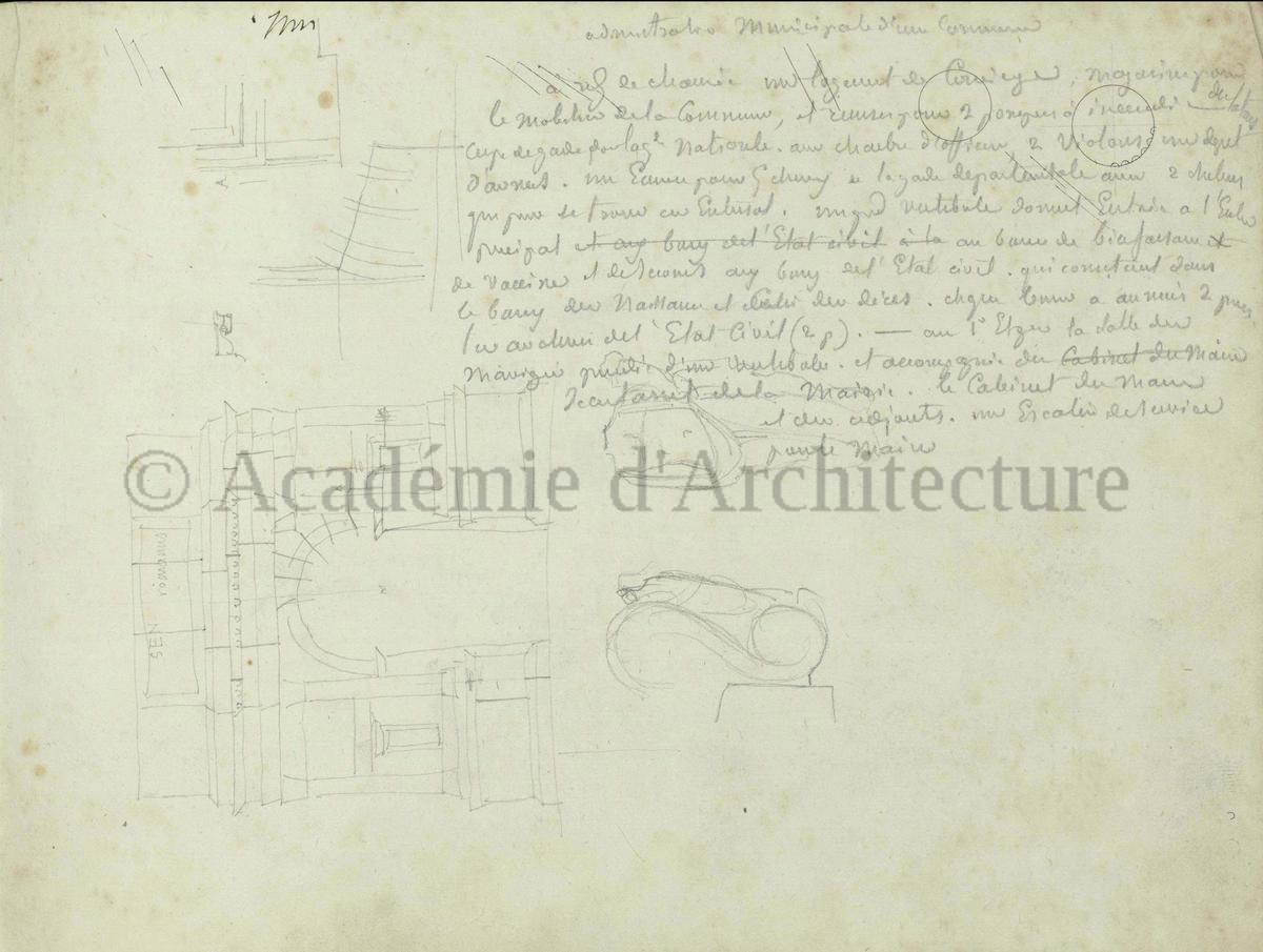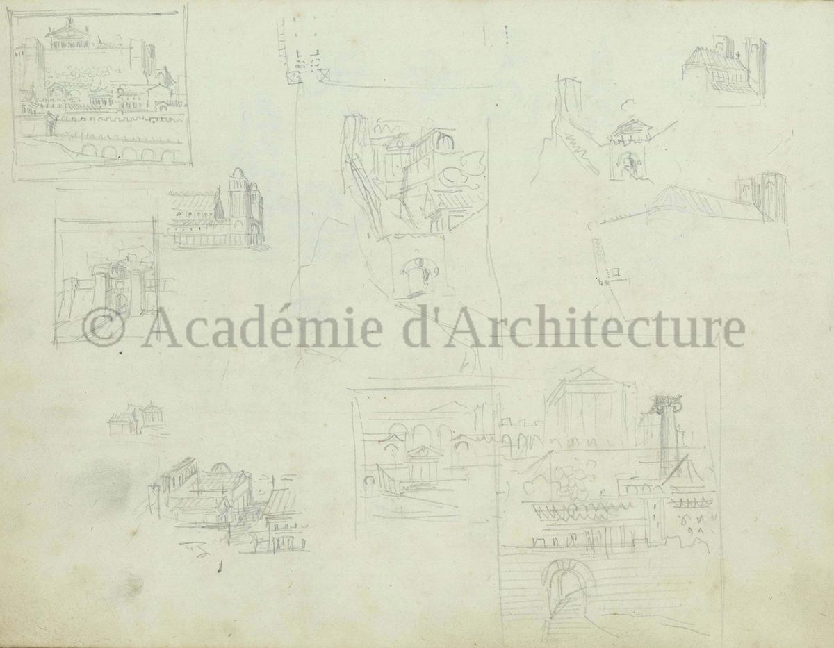 Carnet de relevés de monuments antiques ; d'esquisses pour la restauration de "Posidonia". Brouillon de lettre d'Henri Labrouste au préfet de la Seine relative à l'église de Mantes, s.d. (après 1840). Programme par Henri Labrouste d'un projet de bains d'eau thermale. |