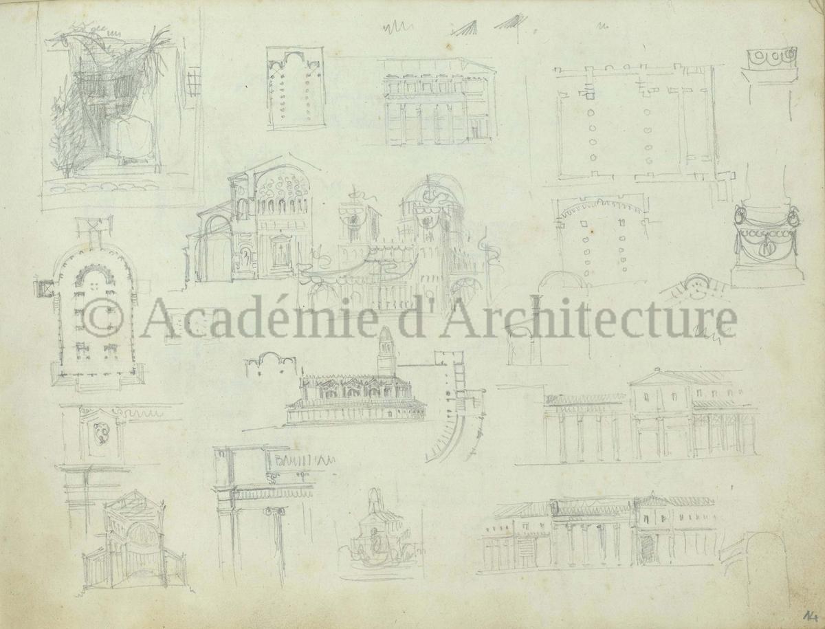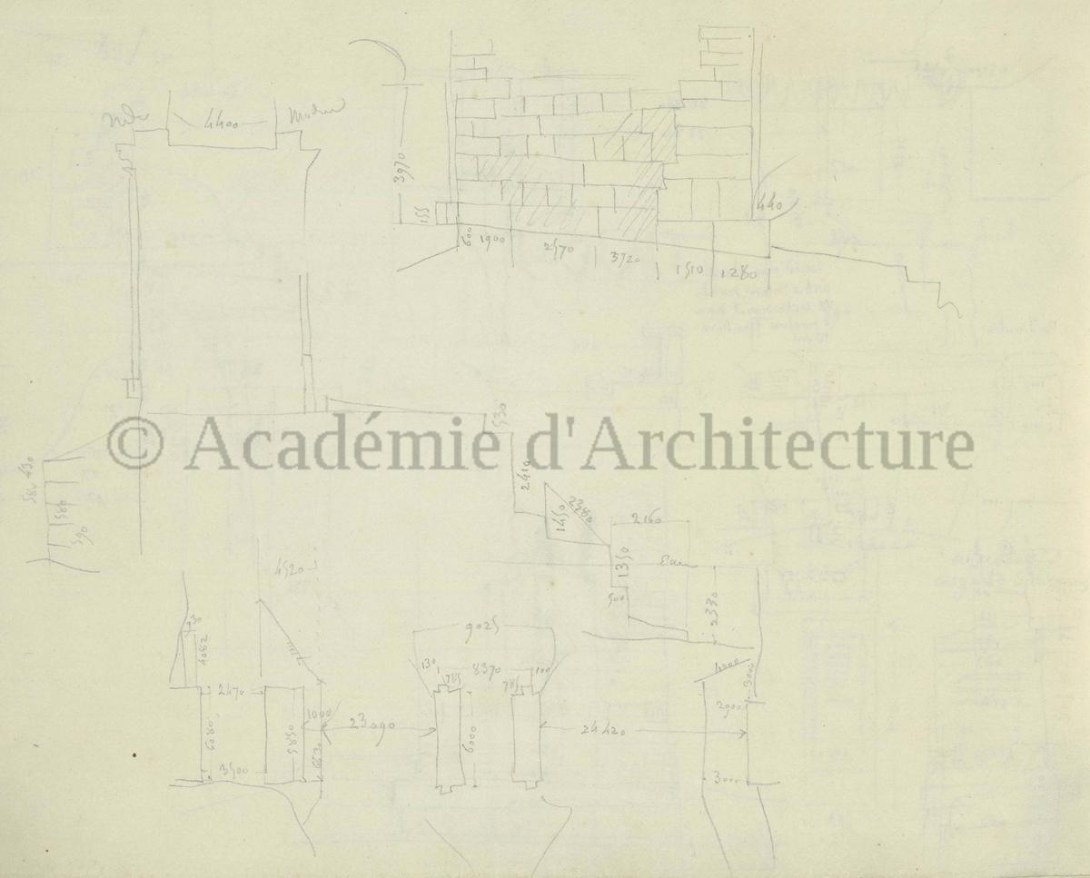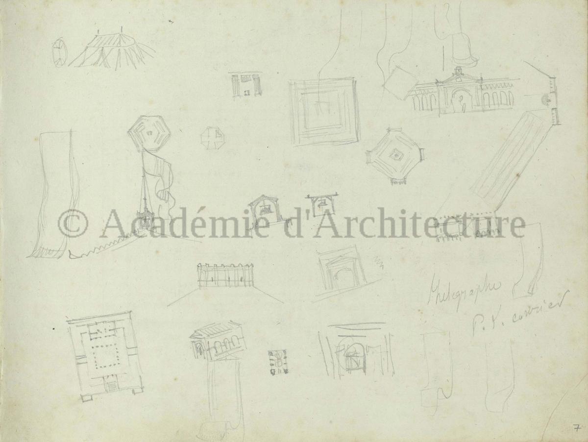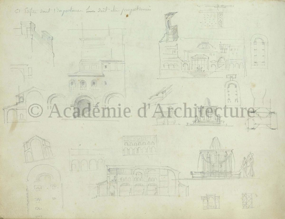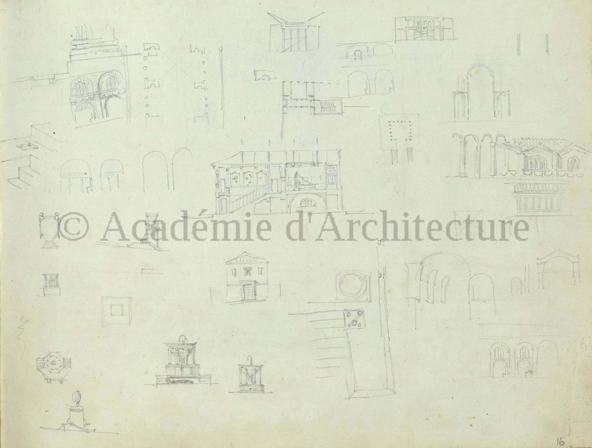 Carnet de relevés de monuments antiques ; d'esquisses pour la restauration de "Posidonia". Brouillon de lettre d'Henri Labrouste au préfet de la Seine relative à l'église de Mantes, s.d. (après 1840). Programme par Henri Labrouste d'un projet de bains d'eau thermale. |