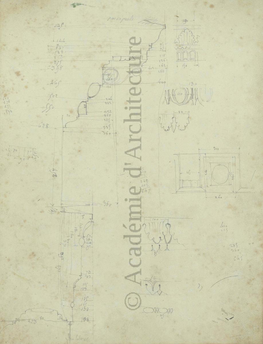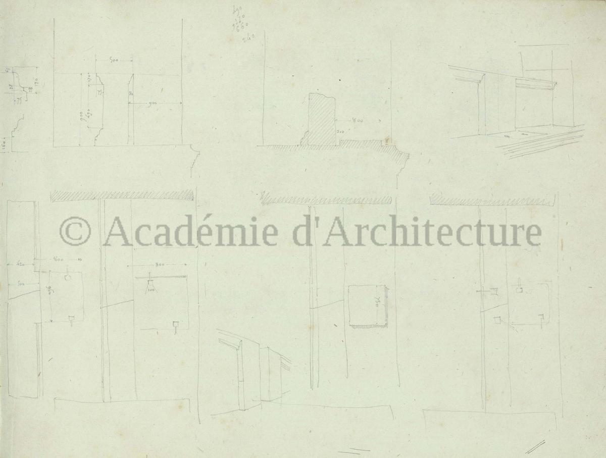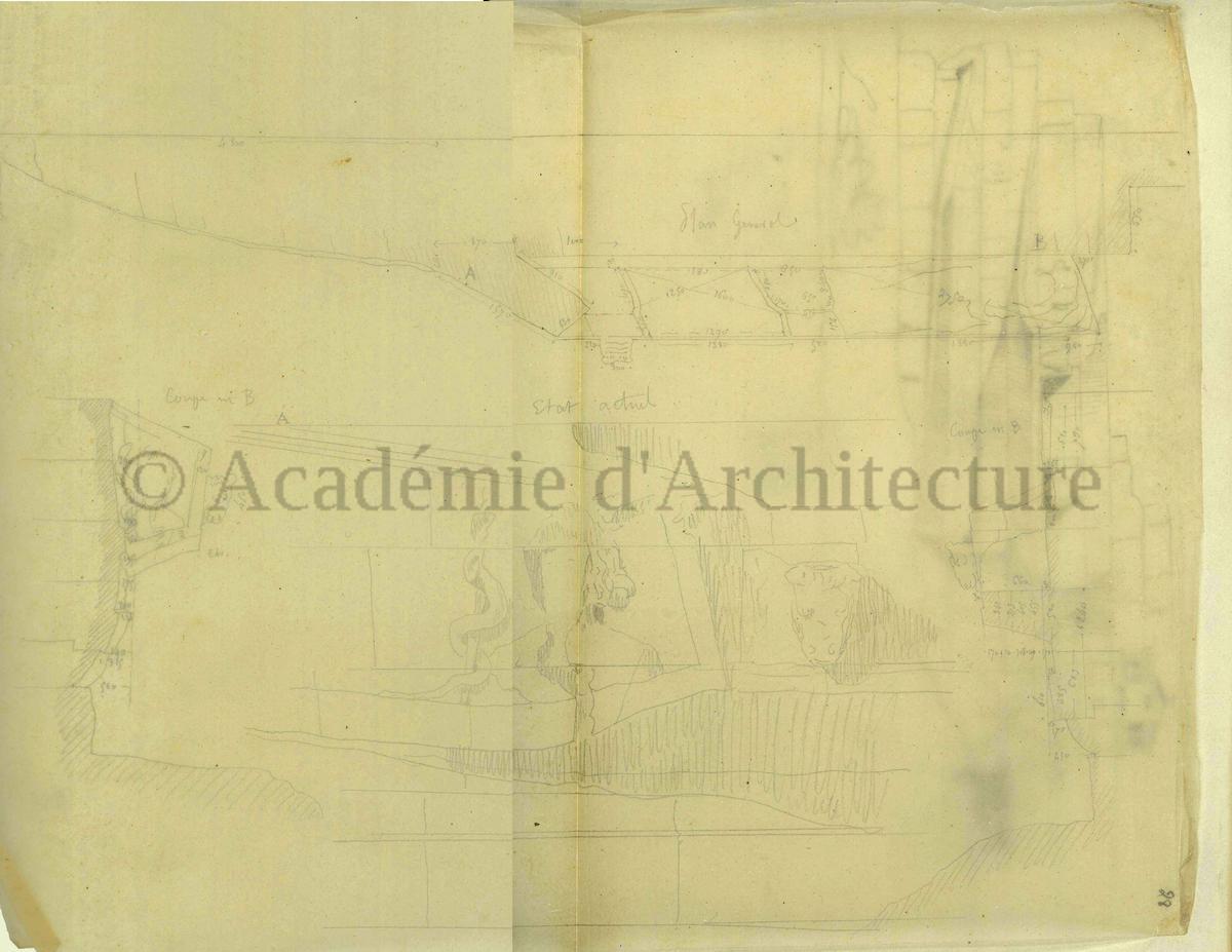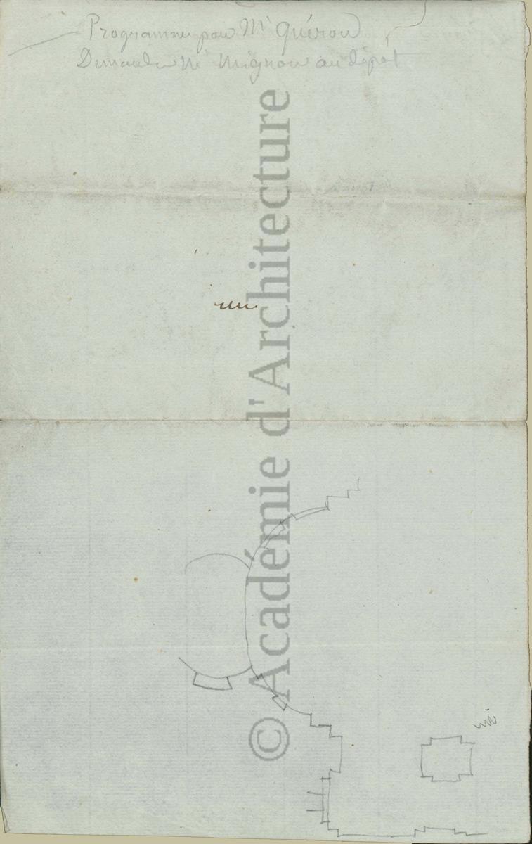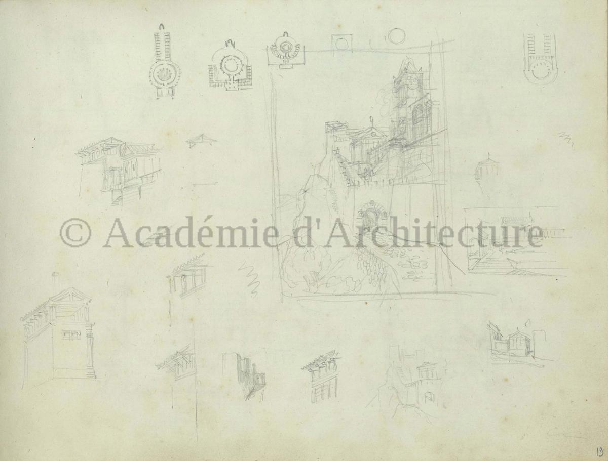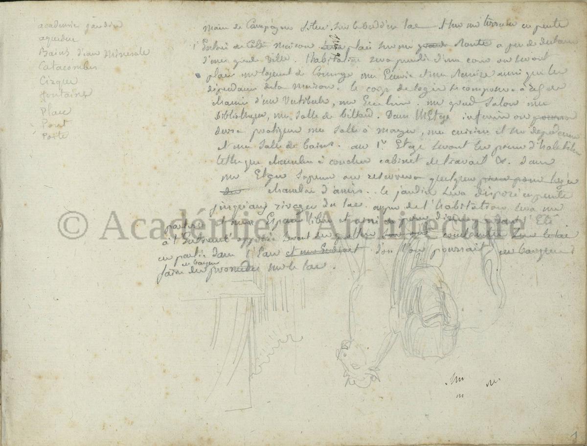 Carnet de relevés de monuments antiques ; d'esquisses pour la restauration de "Posidonia". Brouillon de lettre d'Henri Labrouste au préfet de la Seine relative à l'église de Mantes, s.d. (après 1840). Programme par Henri Labrouste d'un projet de bains d'eau thermale. |