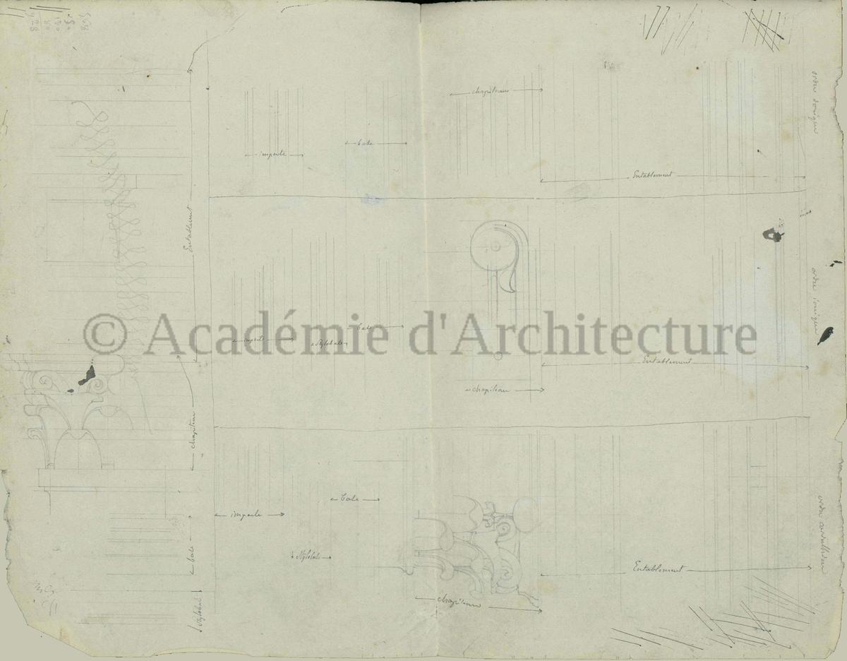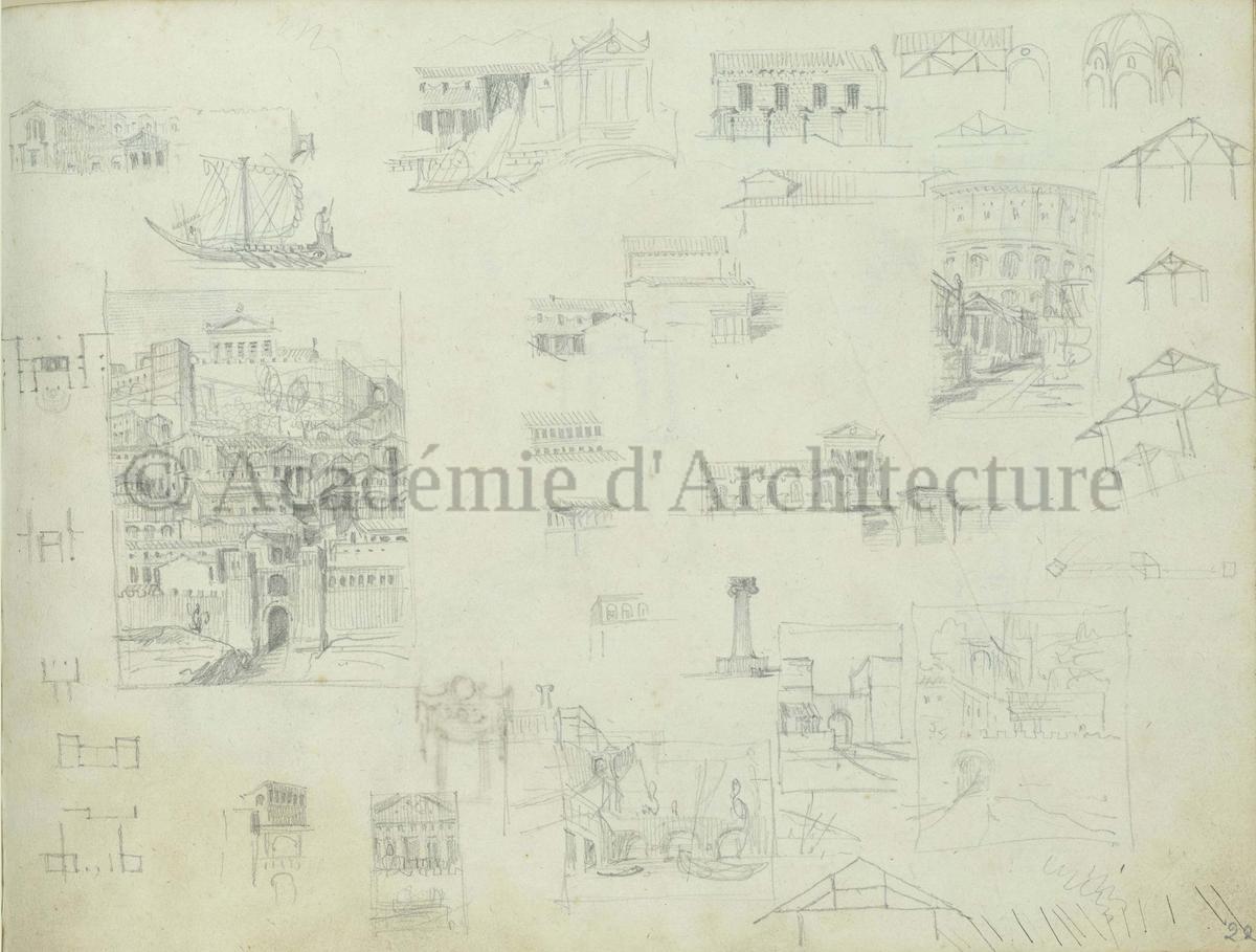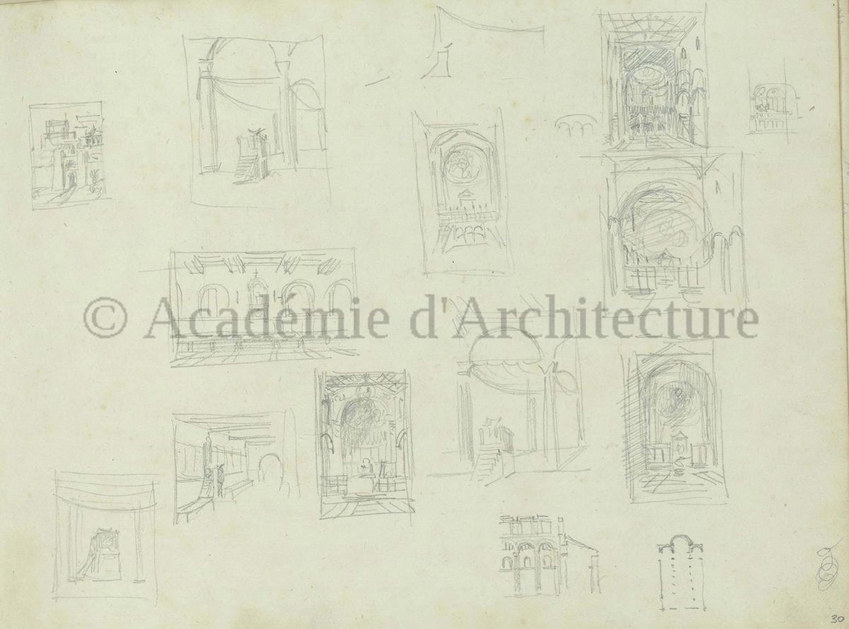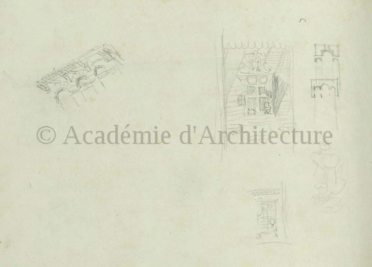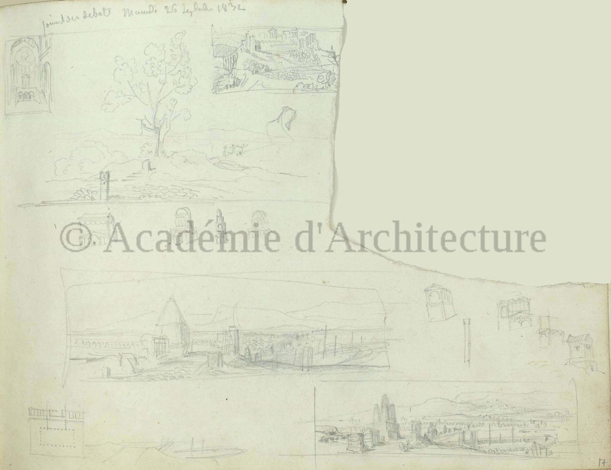 Carnet de relevés de monuments antiques ; d'esquisses pour la restauration de "Posidonia". Brouillon de lettre d'Henri Labrouste au préfet de la Seine relative à l'église de Mantes, s.d. (après 1840). Programme par Henri Labrouste d'un projet de bains d'eau thermale. |