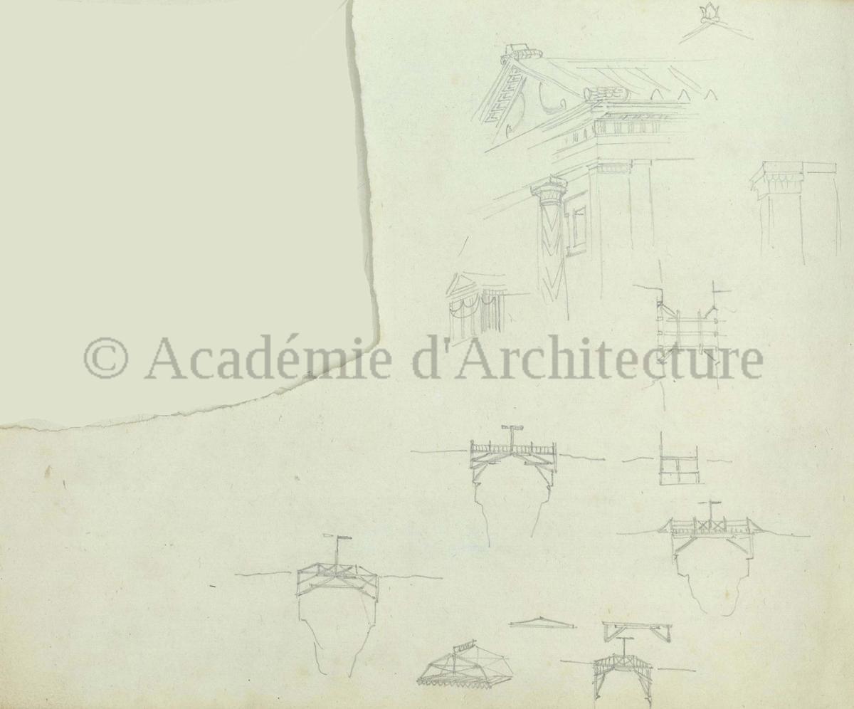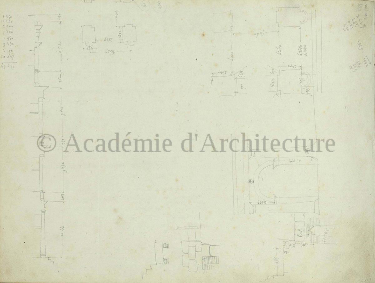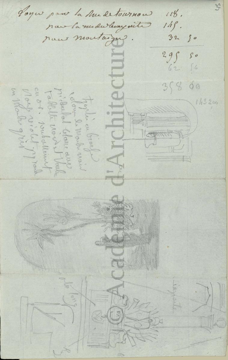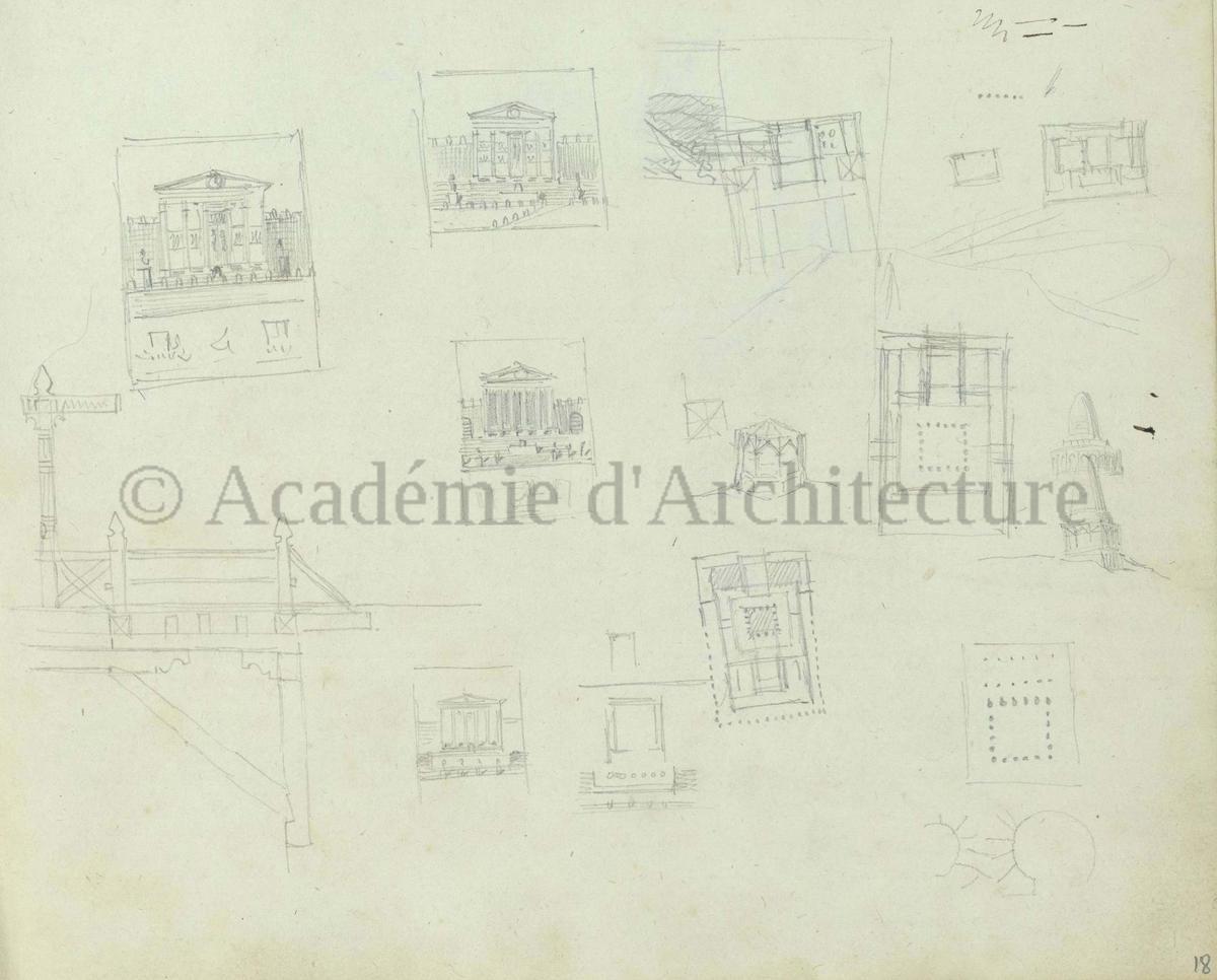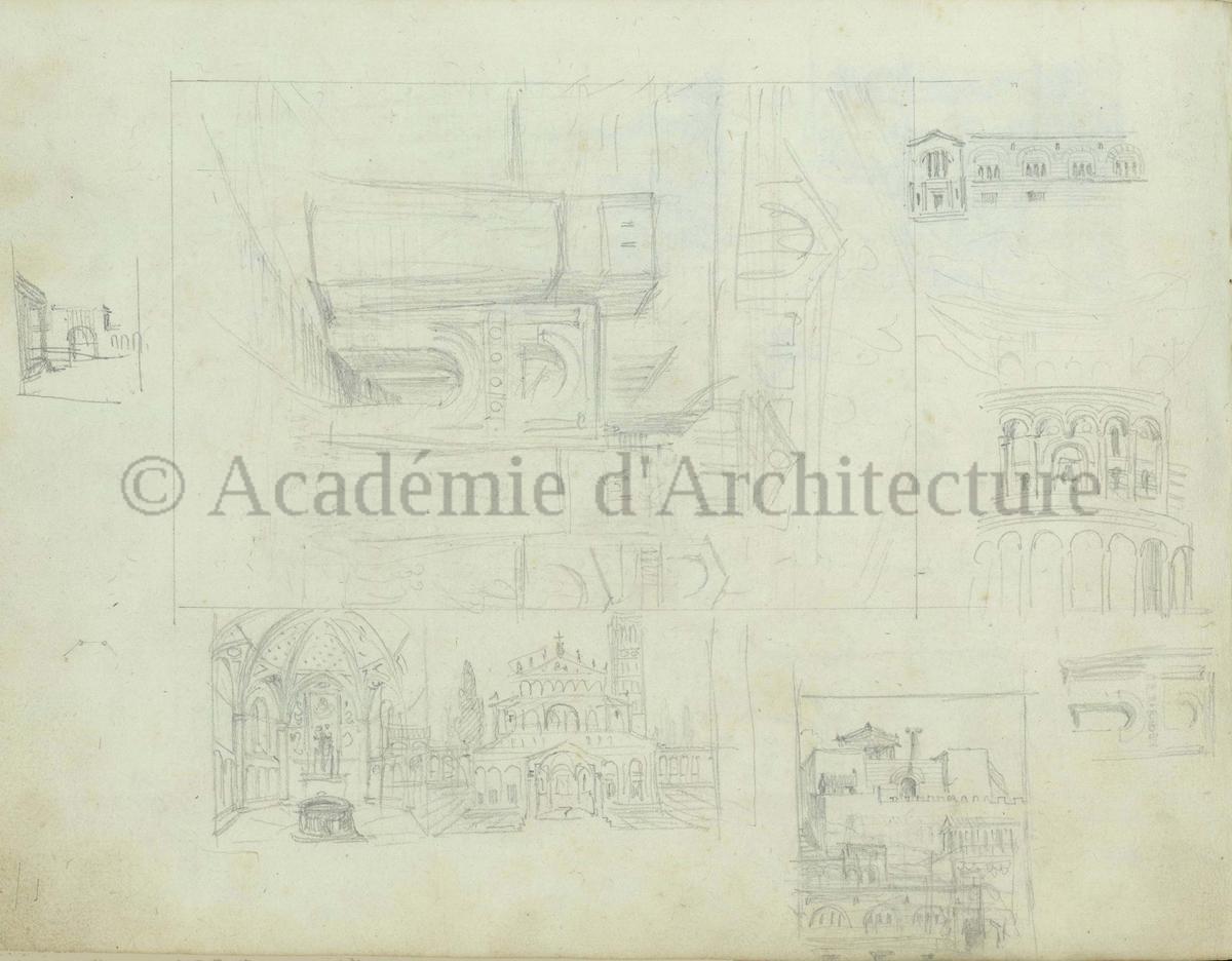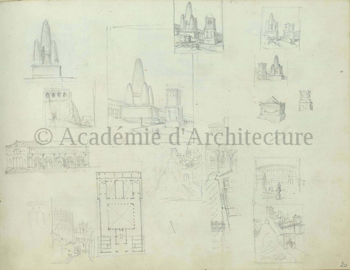 Carnet de relevés de monuments antiques ; d'esquisses pour la restauration de "Posidonia". Brouillon de lettre d'Henri Labrouste au préfet de la Seine relative à l'église de Mantes, s.d. (après 1840). Programme par Henri Labrouste d'un projet de bains d'eau thermale. |