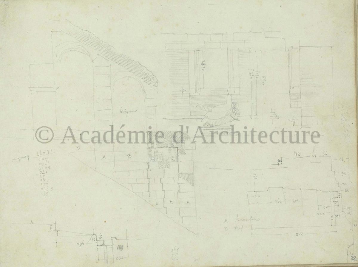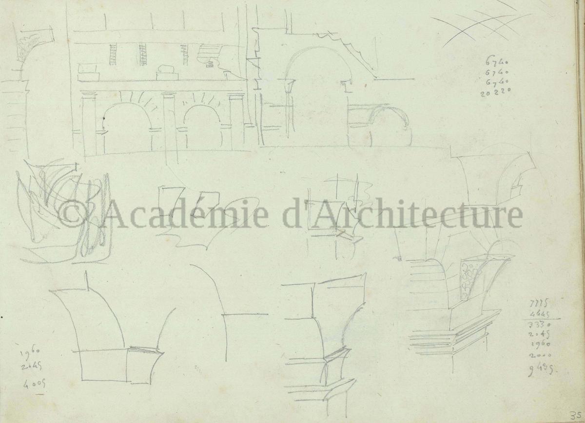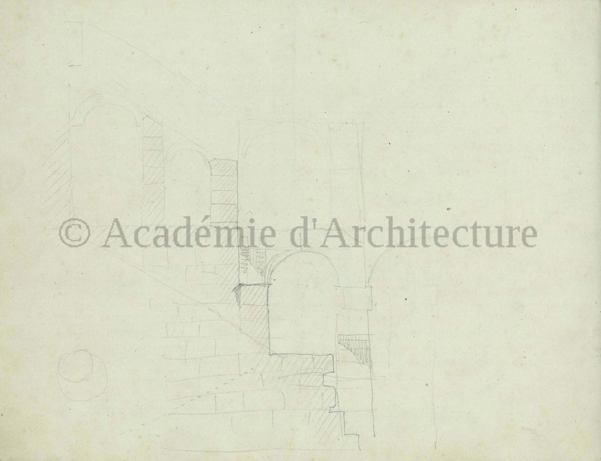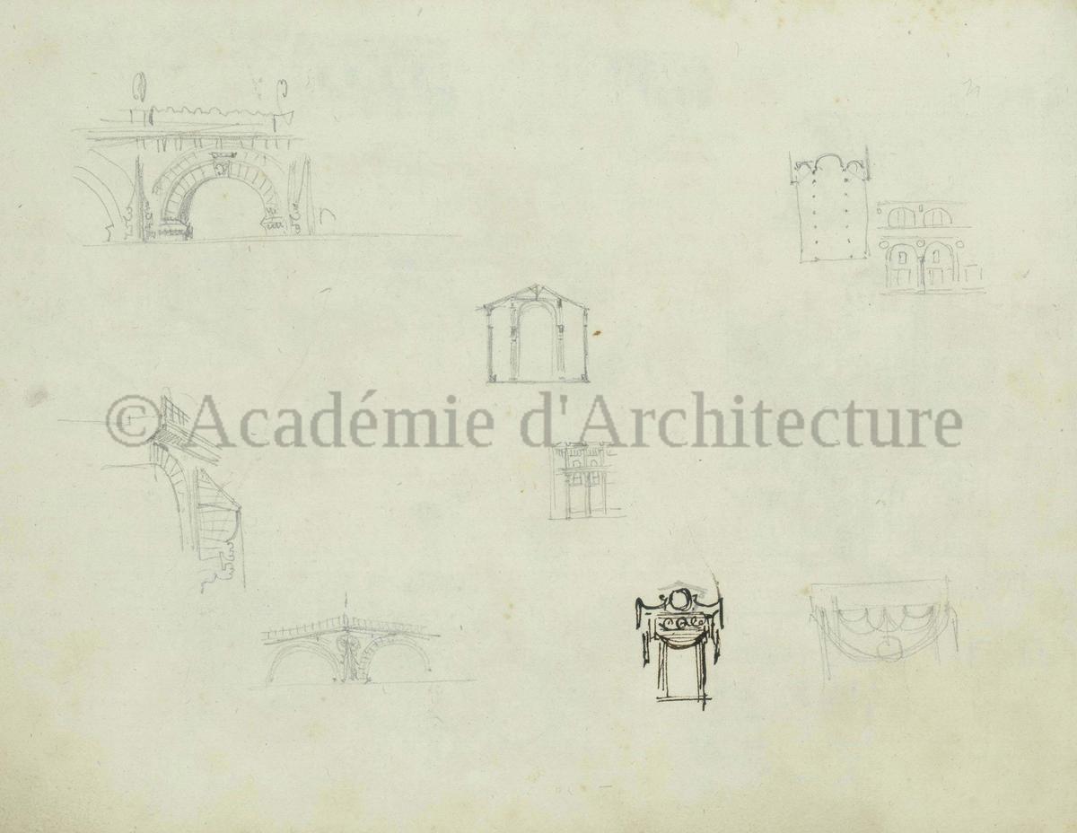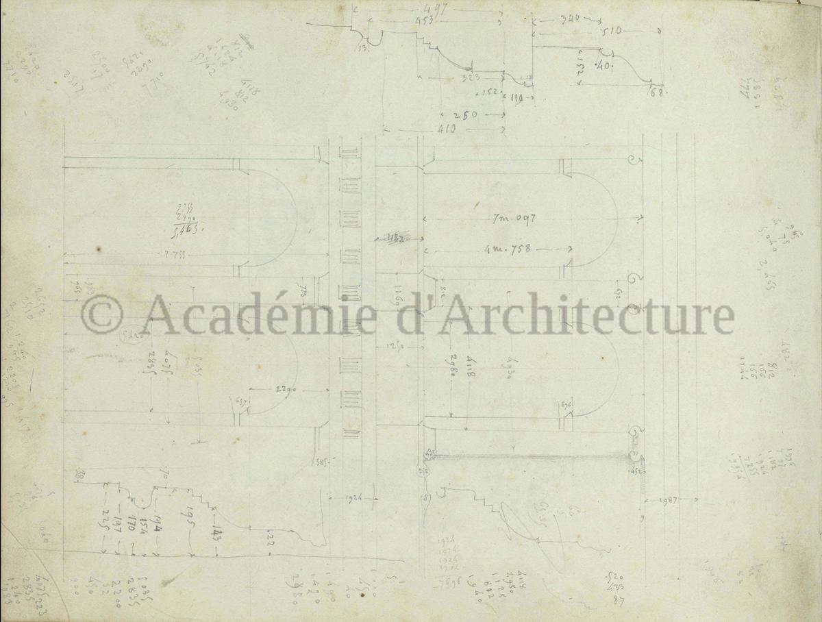 Carnet de relevés de monuments antiques ; d'esquisses pour la restauration de "Posidonia". Brouillon de lettre d'Henri Labrouste au préfet de la Seine relative à l'église de Mantes, s.d. (après 1840). Programme par Henri Labrouste d'un projet de bains d'eau thermale. |