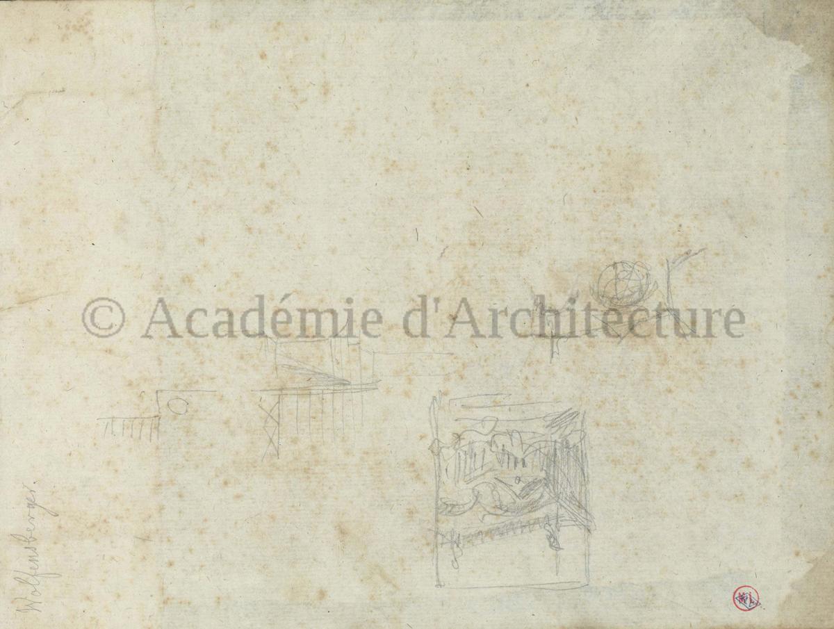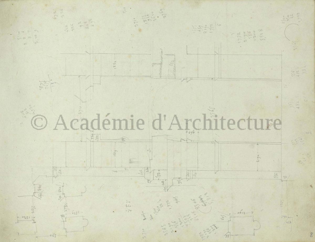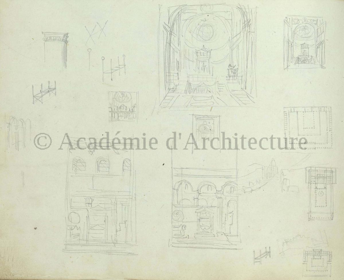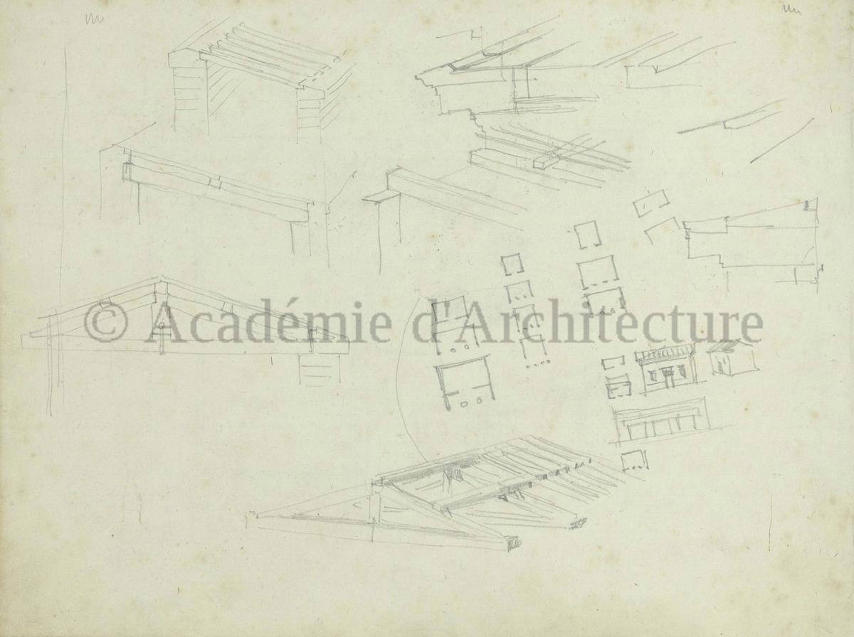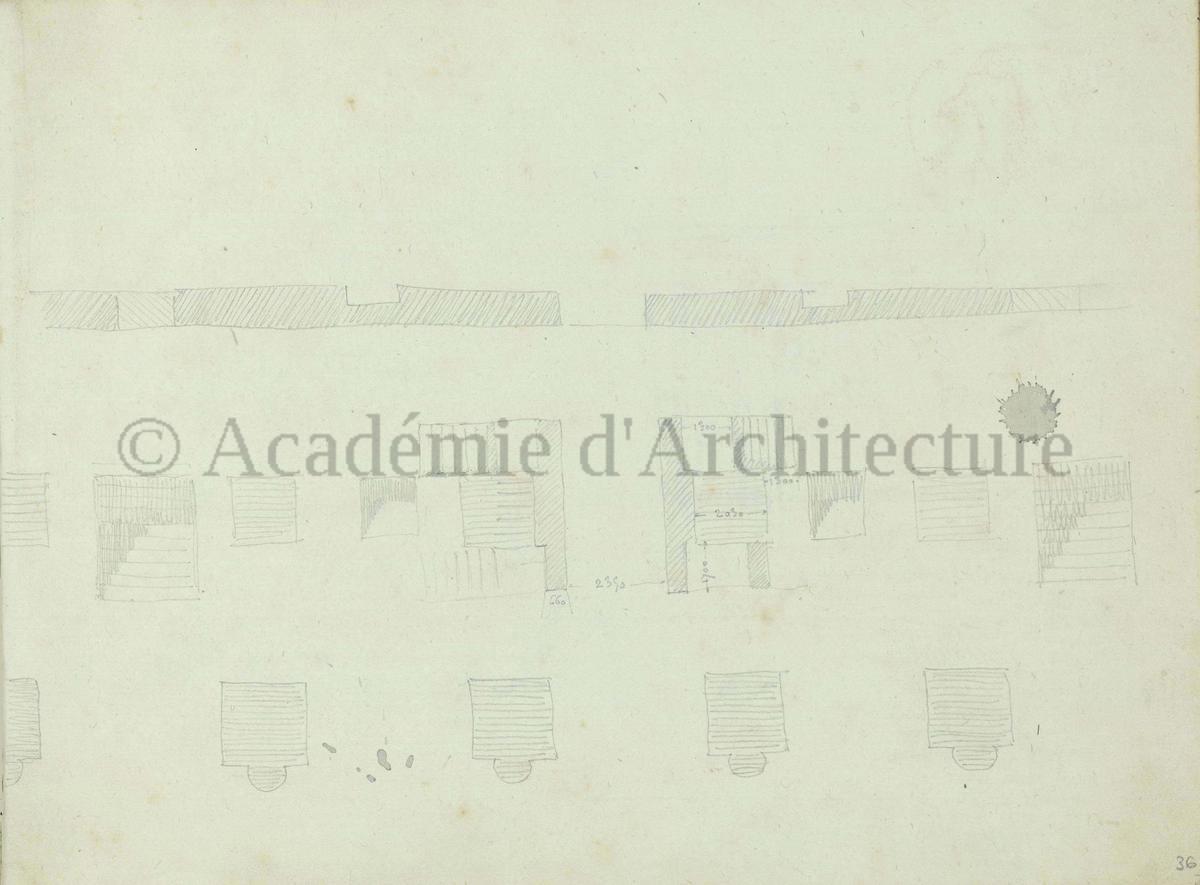 Carnet de relevés de monuments antiques ; d'esquisses pour la restauration de "Posidonia". Brouillon de lettre d'Henri Labrouste au préfet de la Seine relative à l'église de Mantes, s.d. (après 1840). Programme par Henri Labrouste d'un projet de bains d'eau thermale. |