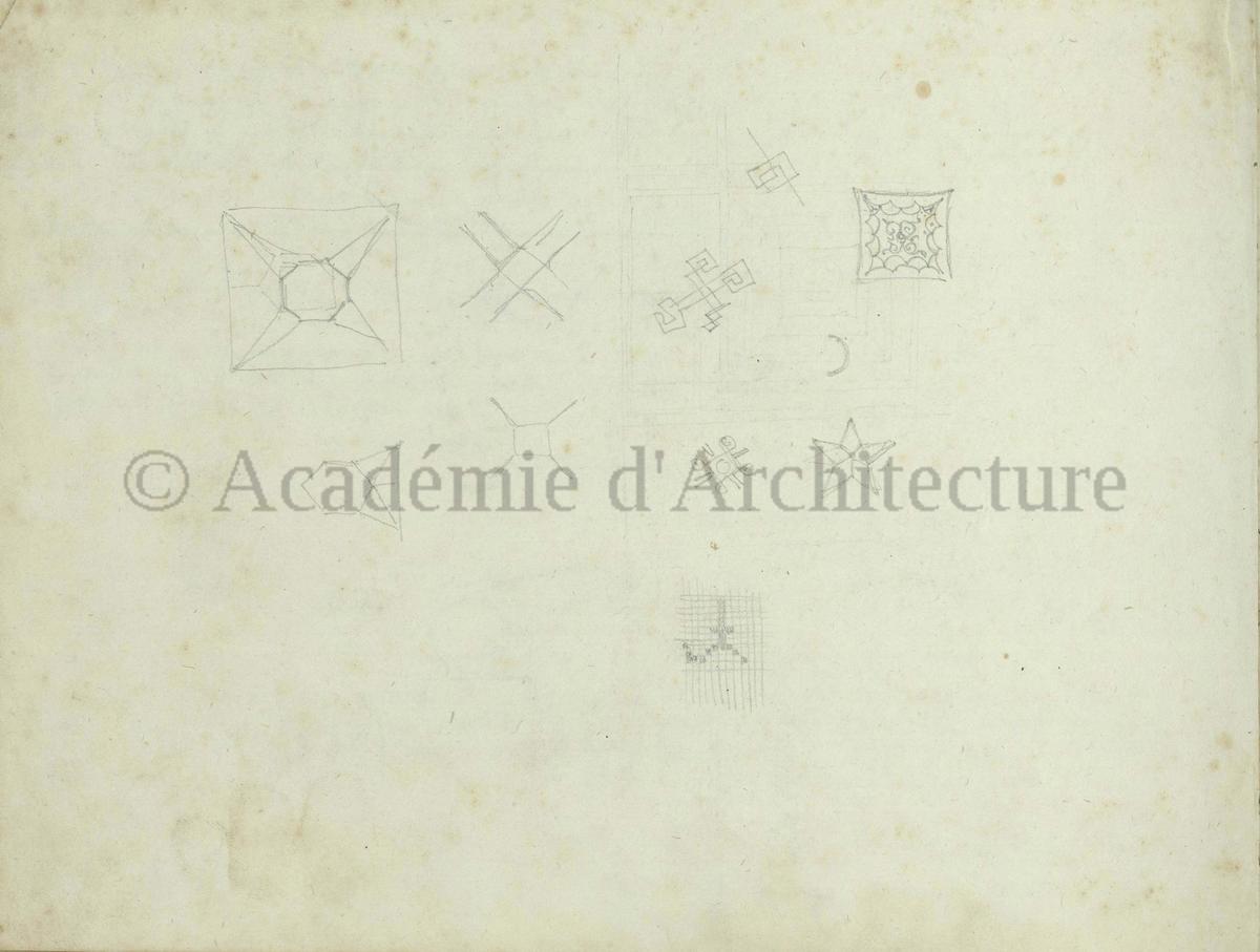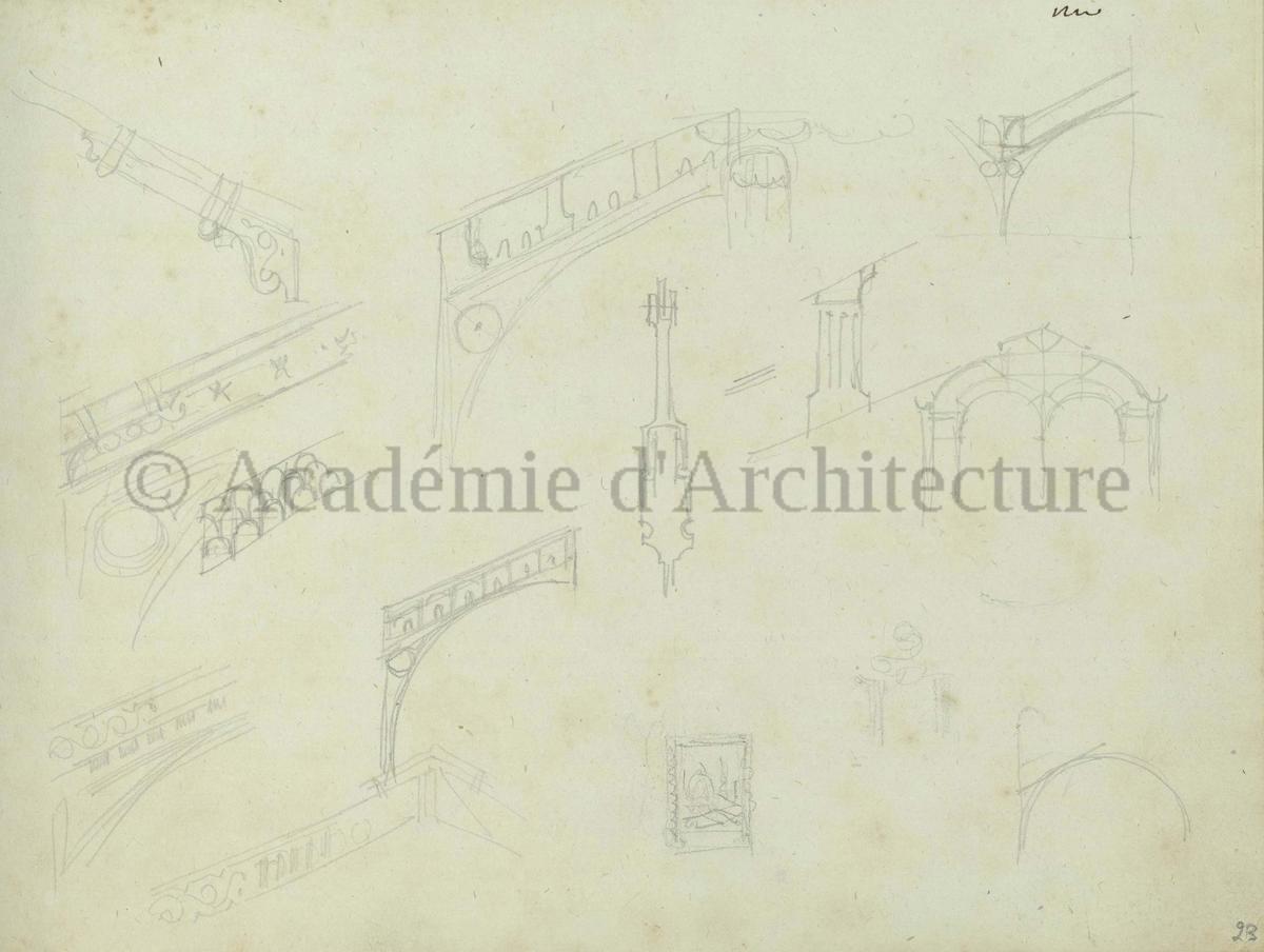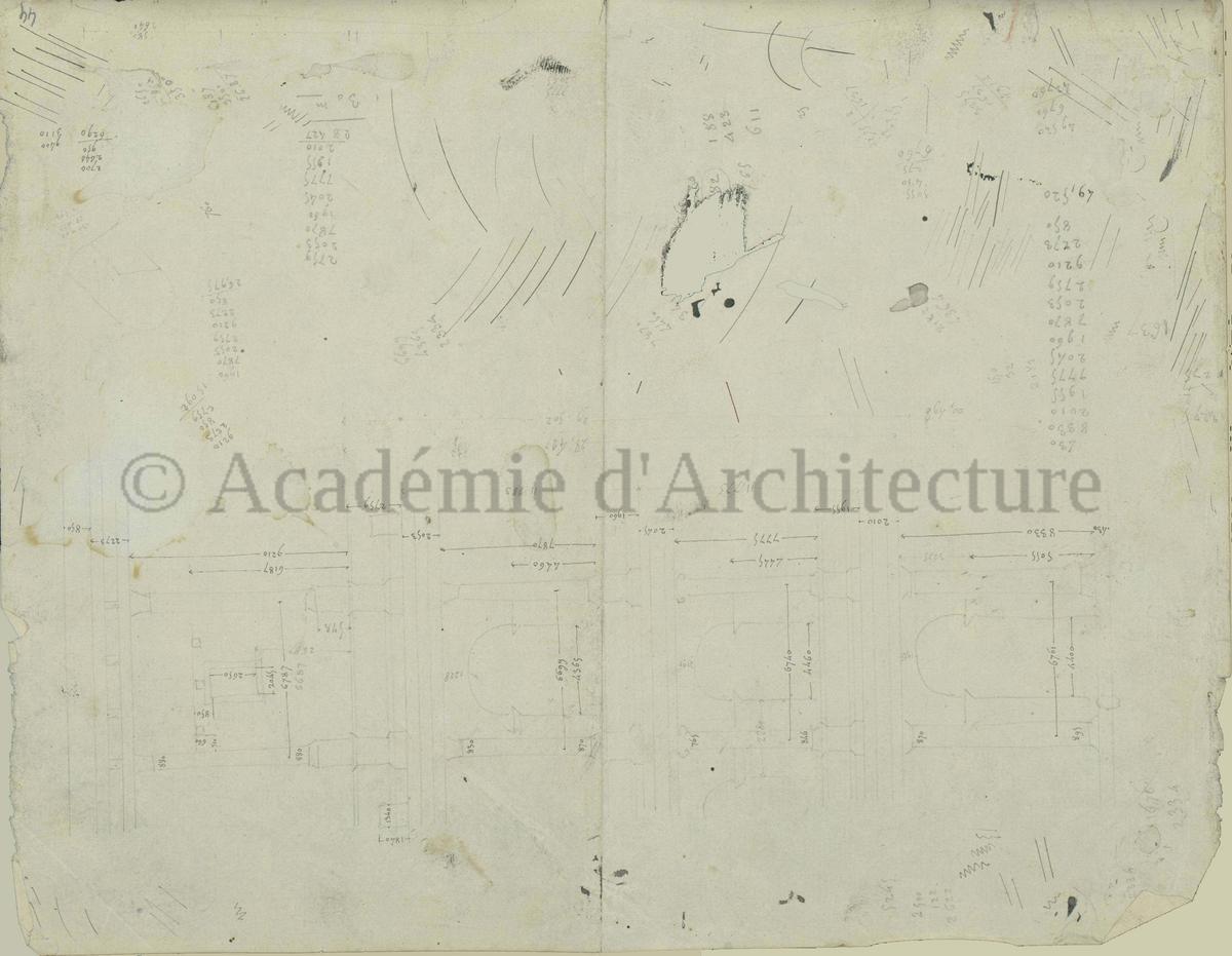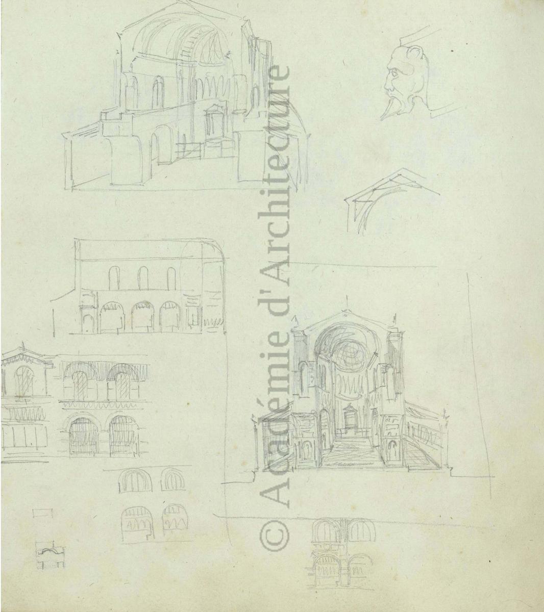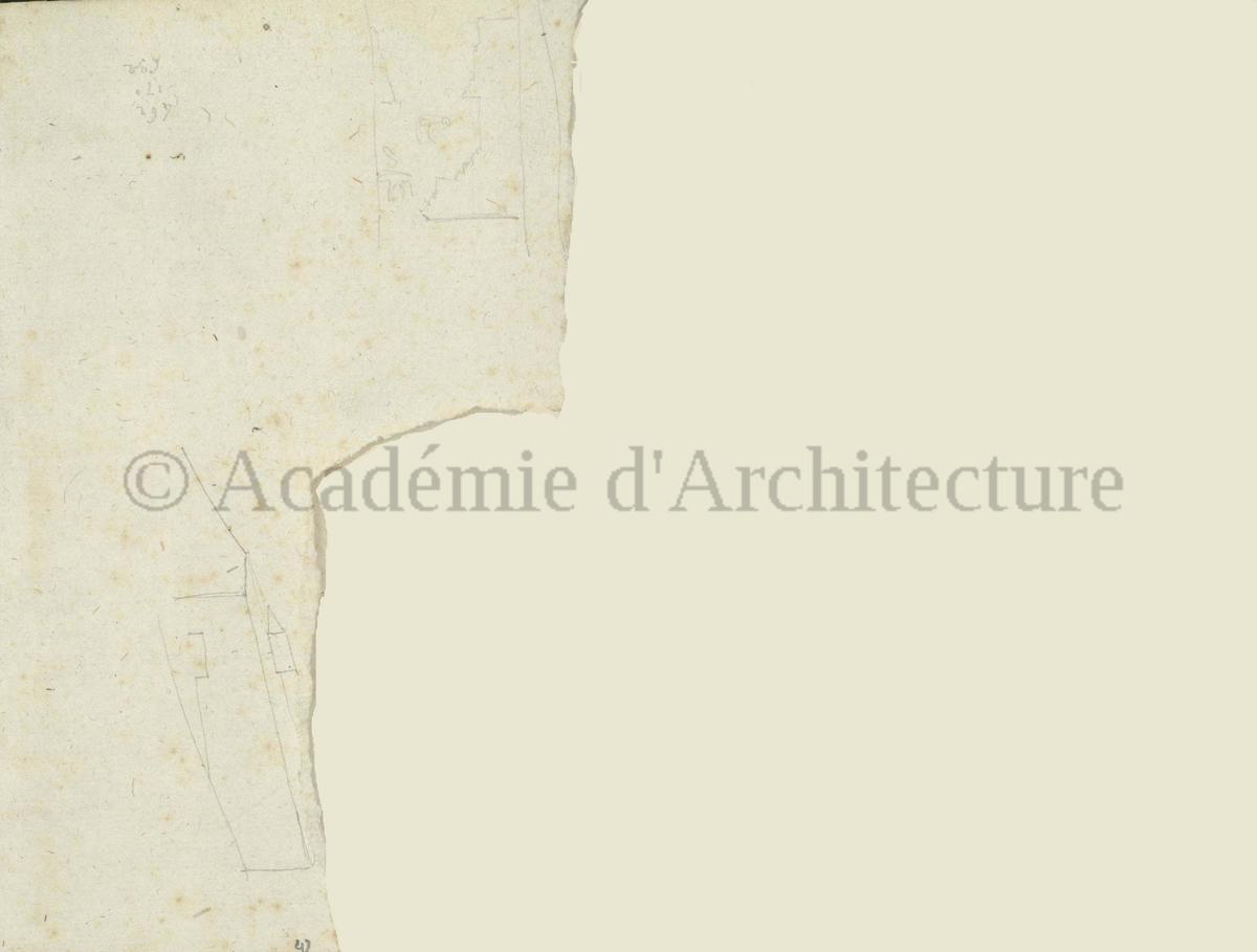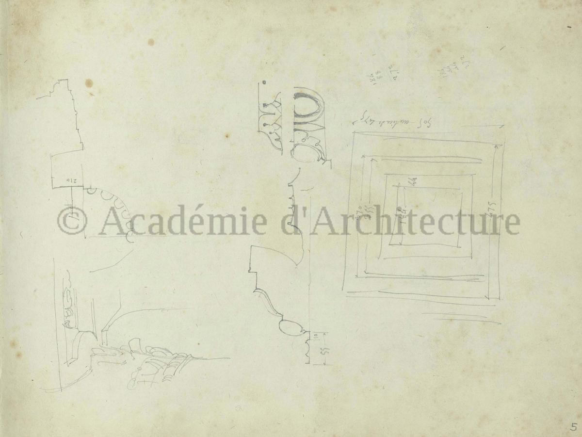 Carnet de relevés de monuments antiques ; d'esquisses pour la restauration de "Posidonia". Brouillon de lettre d'Henri Labrouste au préfet de la Seine relative à l'église de Mantes, s.d. (après 1840). Programme par Henri Labrouste d'un projet de bains d'eau thermale. |