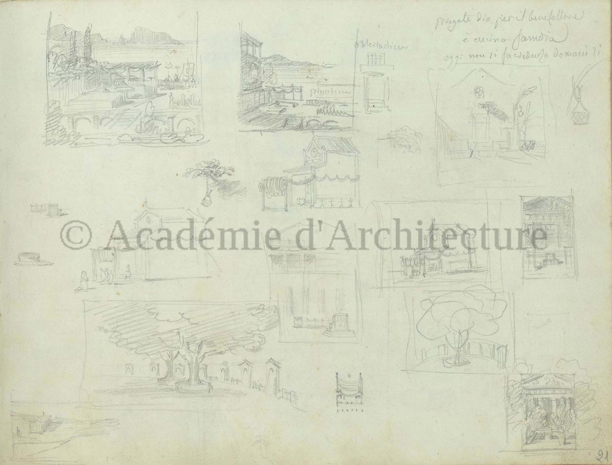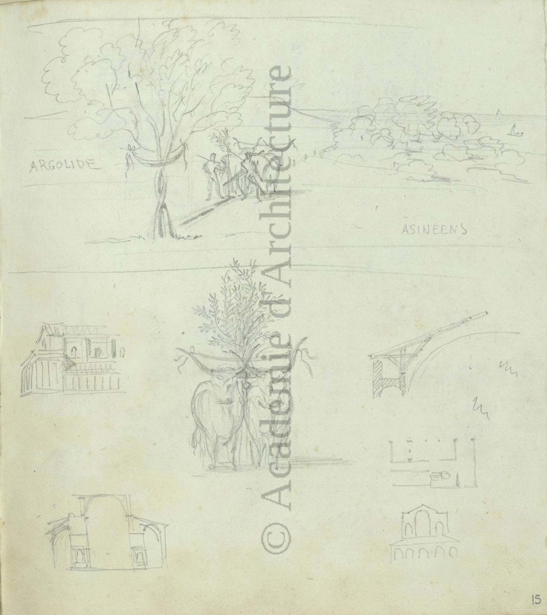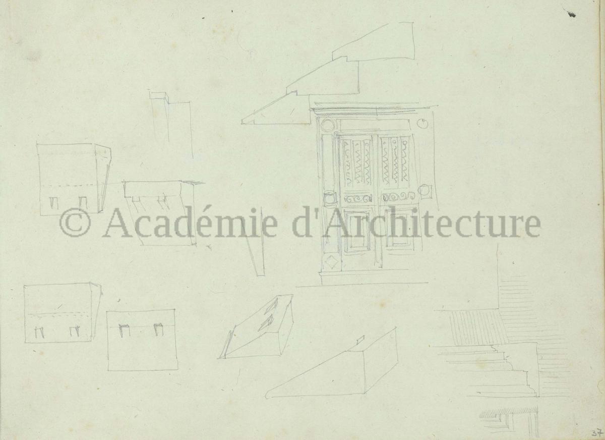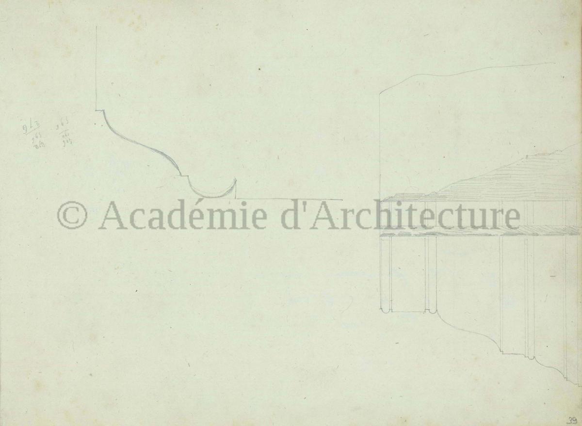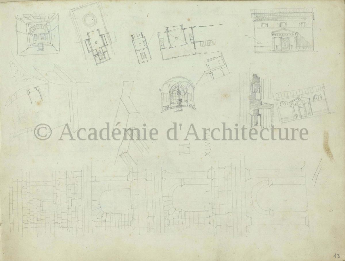 Carnet de relevés de monuments antiques ; d'esquisses pour la restauration de "Posidonia". Brouillon de lettre d'Henri Labrouste au préfet de la Seine relative à l'église de Mantes, s.d. (après 1840). Programme par Henri Labrouste d'un projet de bains d'eau thermale. |